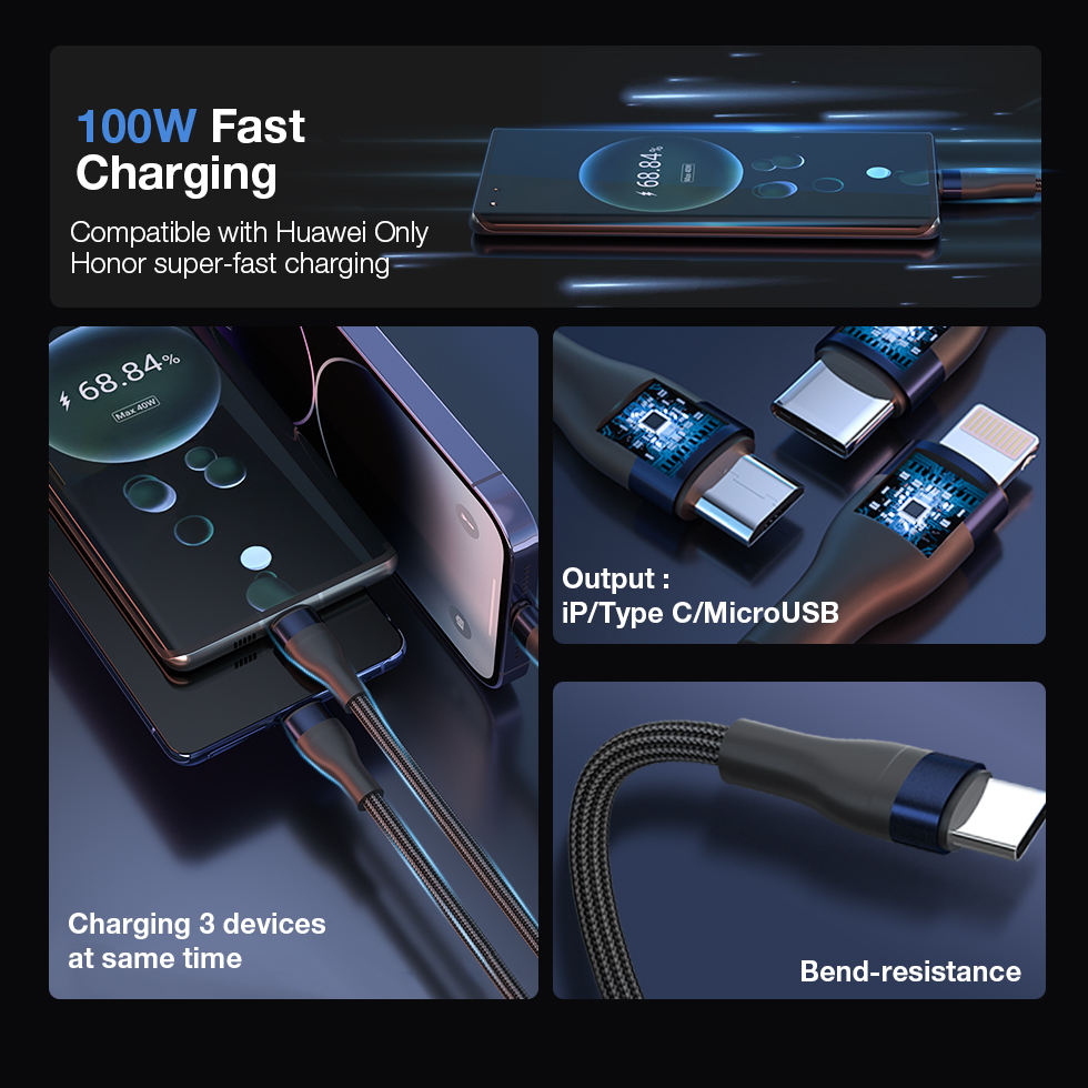 • Triple Simultaneous Charging Cable (Micro USB, iP and Type-C)