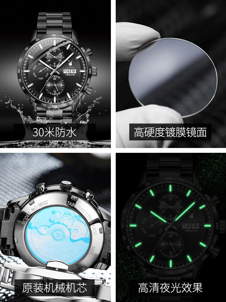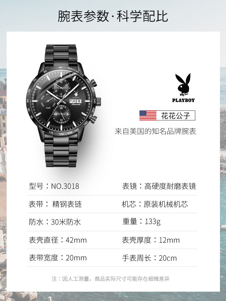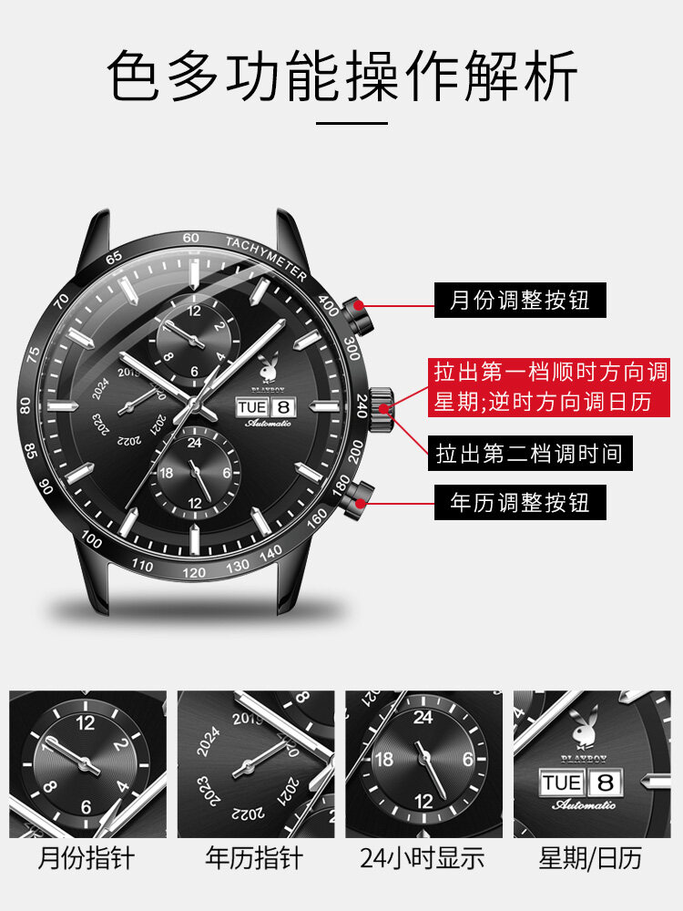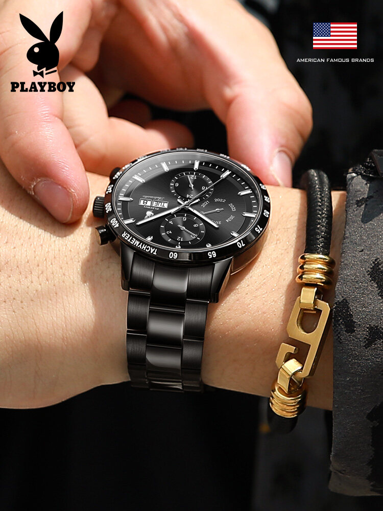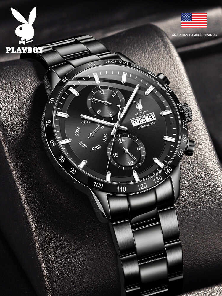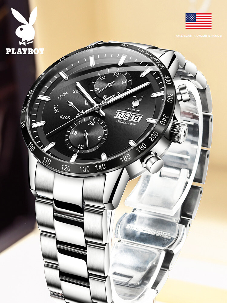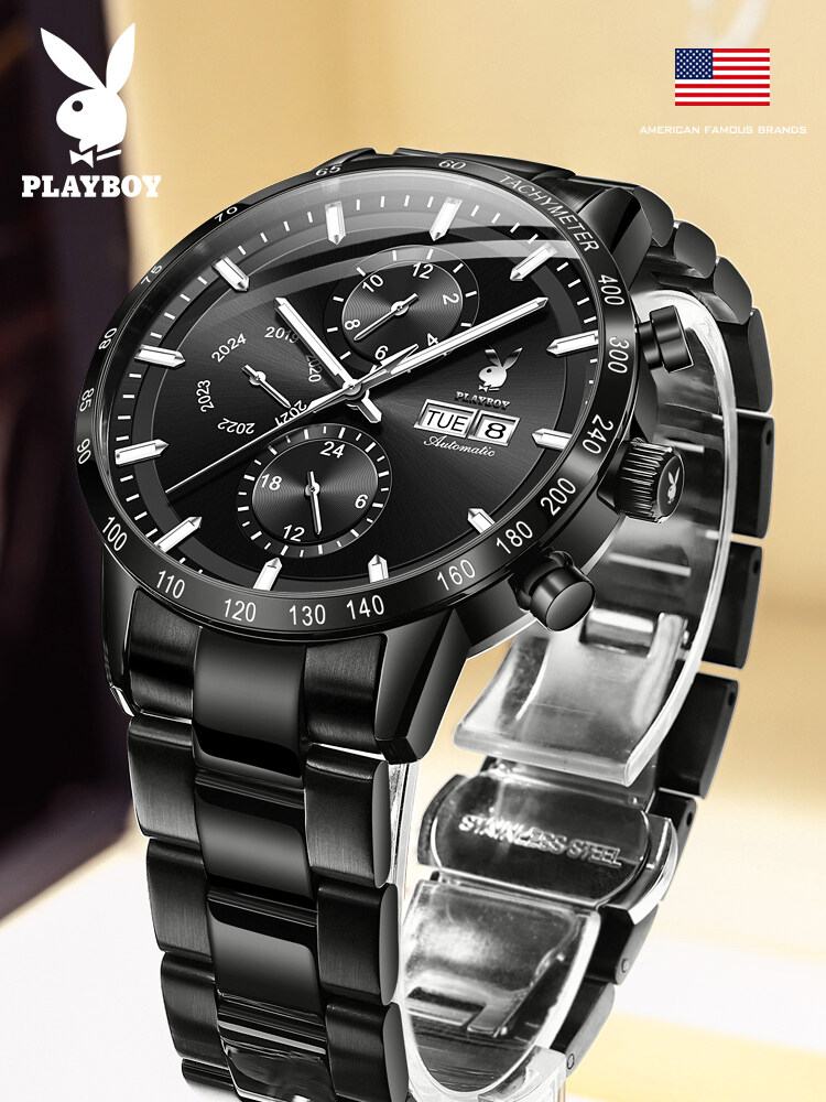 PLAYBOY American Famous Brand Watches Fashion Business Mechanical watch For Men Waterproof Stainless Steel Strap Luminous Dual Calendar Display