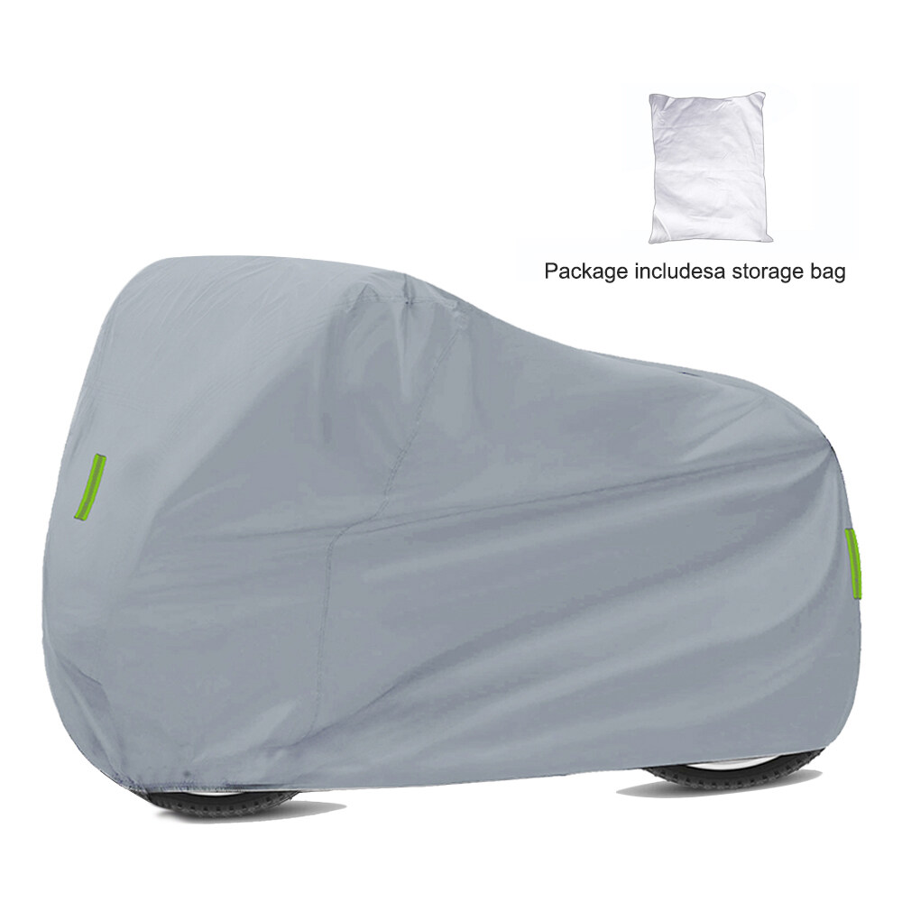 Made of 210D oxford cloth fabric with water-resistant backing for protection against rain, snow, sun, and dust. The compact and lightweight bike cover can be foldable, and very convenient and portable to carry anywhere. It can provide all-season protection to your bike from rain, snow, leaves, bird droppings, wind, dust, scratches, etc.