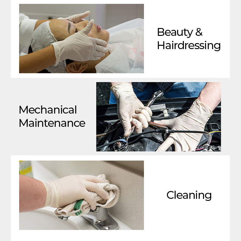 [Advantages of duty-free PVC gloves]: 1 Dust free PVC gloves have excellent chemical resistance, acid resistance, Alkali resistance and oil resistance. 2 Dust free PVC gloves have strong tense strength, junction resistance, and are not easy to break. 3 The dust free PVC gloves have good air tightness and can effectively prevent the dust from being emitted outward Dust-free PVC gloves have no silicon component and have received antagonistic properties, which are suitable for the production needs of the electronics industry. 5. Dust-free PVC gloves are compatible to wear, and will not cause skin tension when word for a long time, which is conductive to blood circulation. 6 Dust free PVC gloves are non toxic, severity, free of amino compounds and other hazardous substances, and rare cause allergies. 7 The duty-free PVC gloves have low chemical residues on the surface, low ion content, and low particle content They are suitable for strict clean room environments Disposable gloves are mainly used in hygiene, catering, beauty salons and food processing, factory workshops, microelectronics, computers, communications, semiconductor assembly, ink printing, daily household cleaning, kitchen rubbing, etc