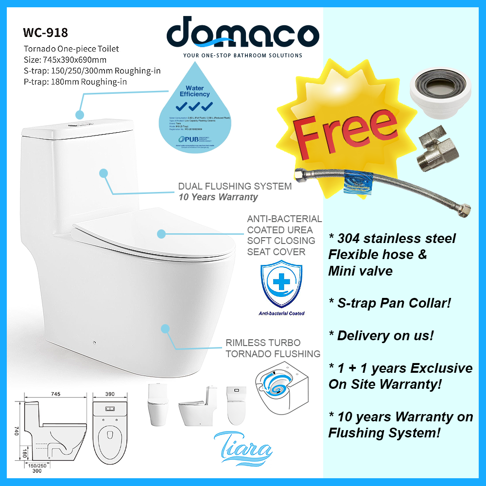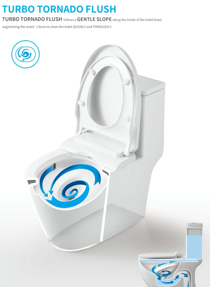 Tiara 918 Rimless Turbo Tornado Flushing 1-Piece Toilet Bowl with Slim Urea Seat Cover