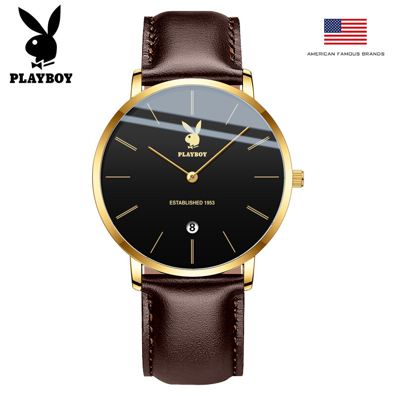 Imported original PLAYBOY men's watch, genuine leather strap,two-hand calendar quartz casual watch