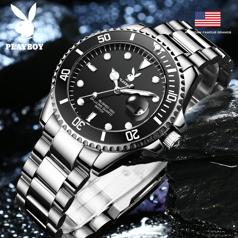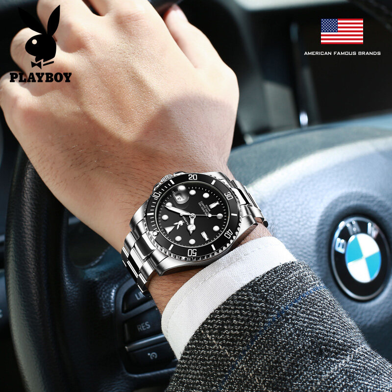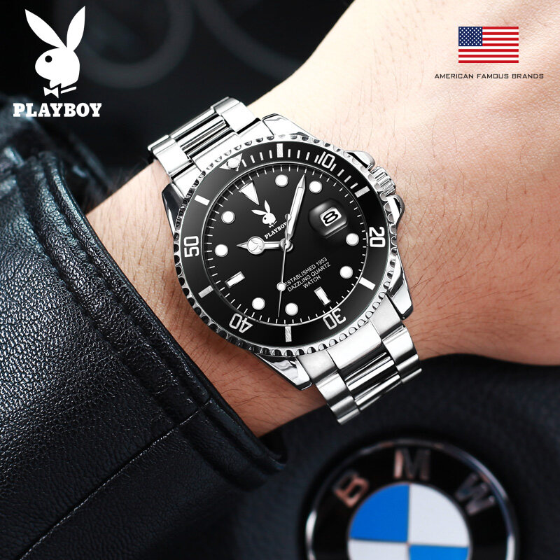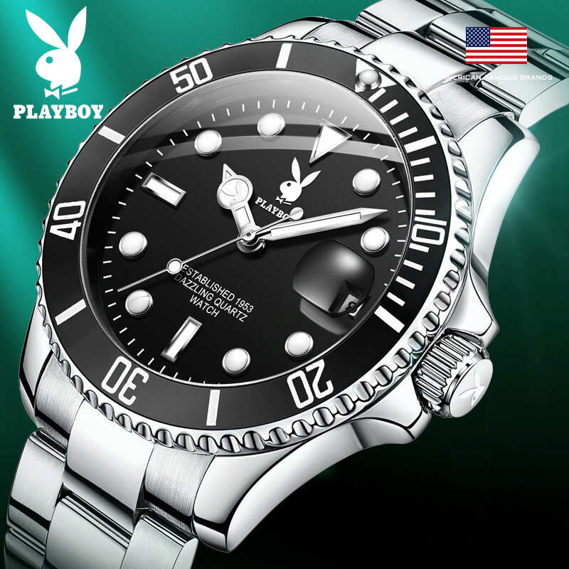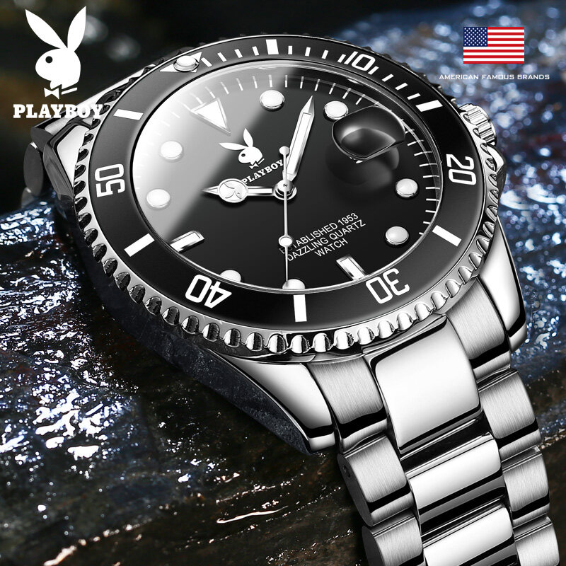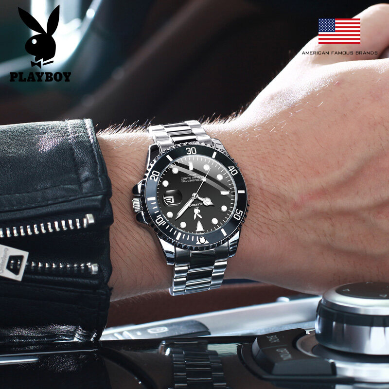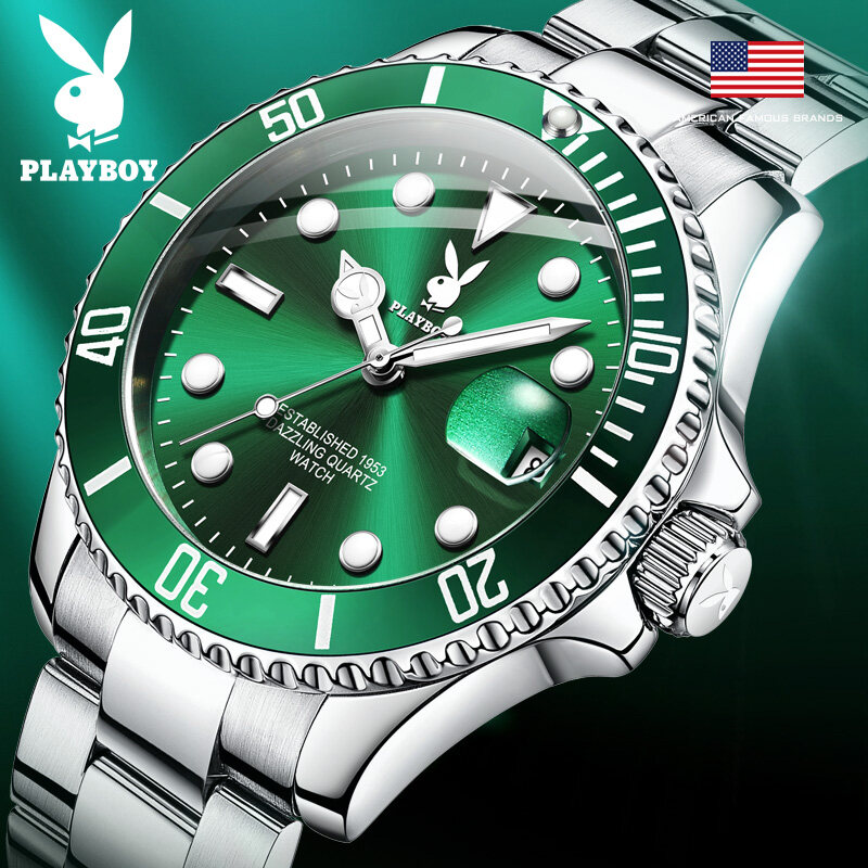 PLAYBOY Watch for men 2022 Original Deep Waterproof Luminous Calendar Fashion Green Water Ghost Design Stainless Steel Strap Diving Watch