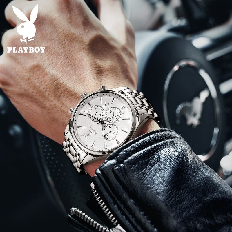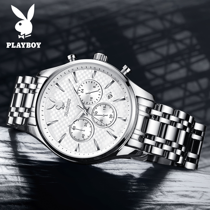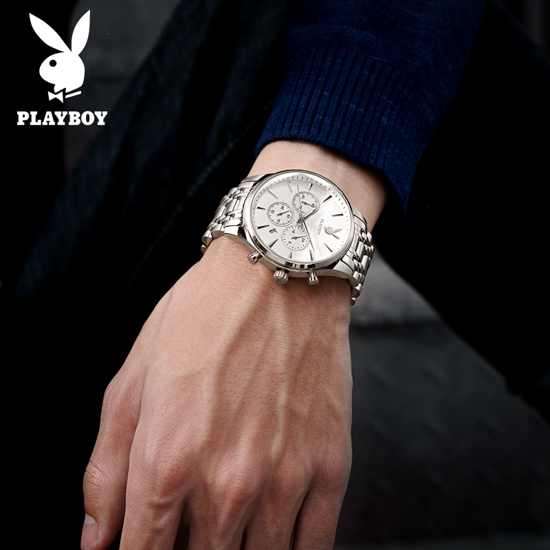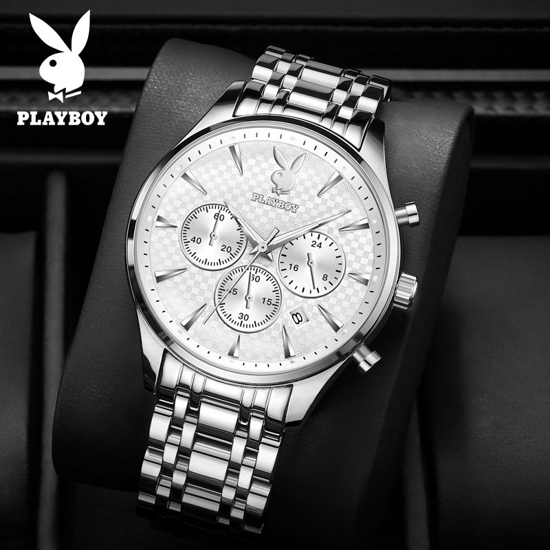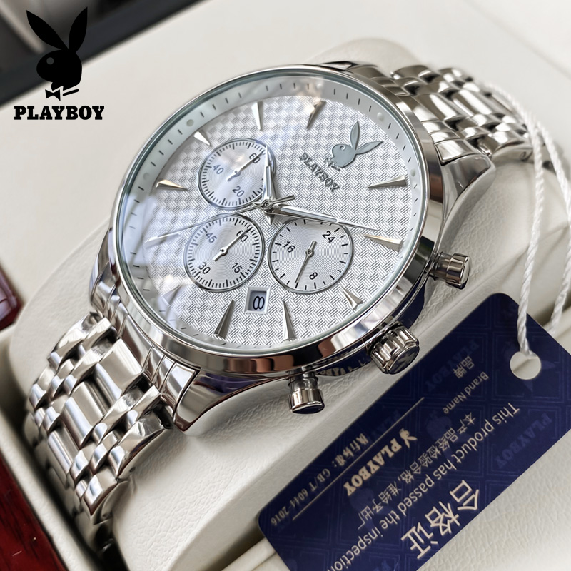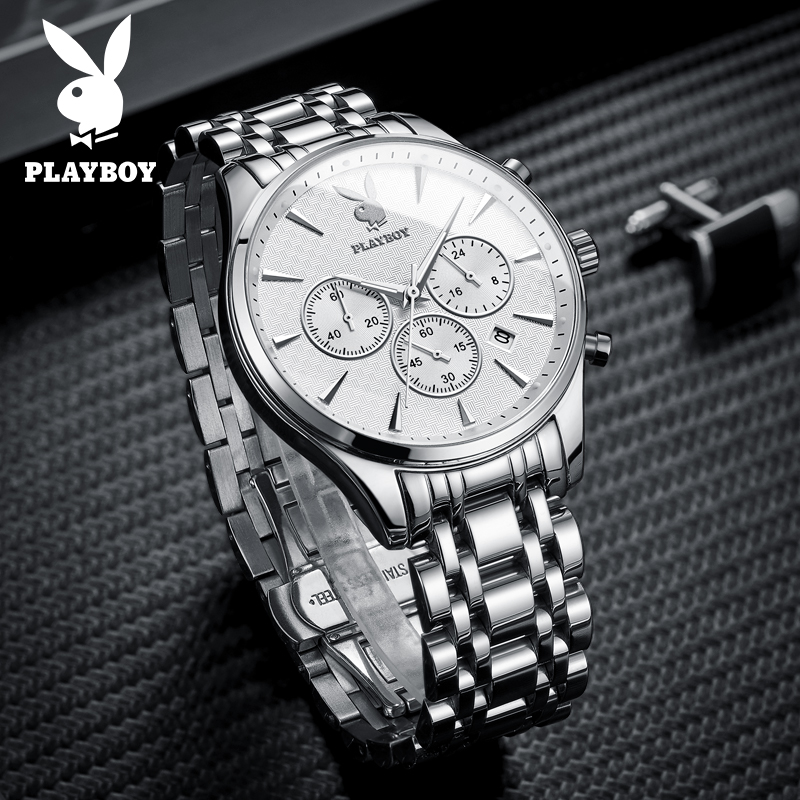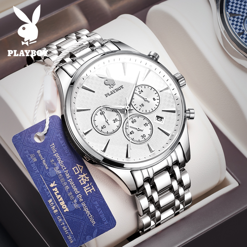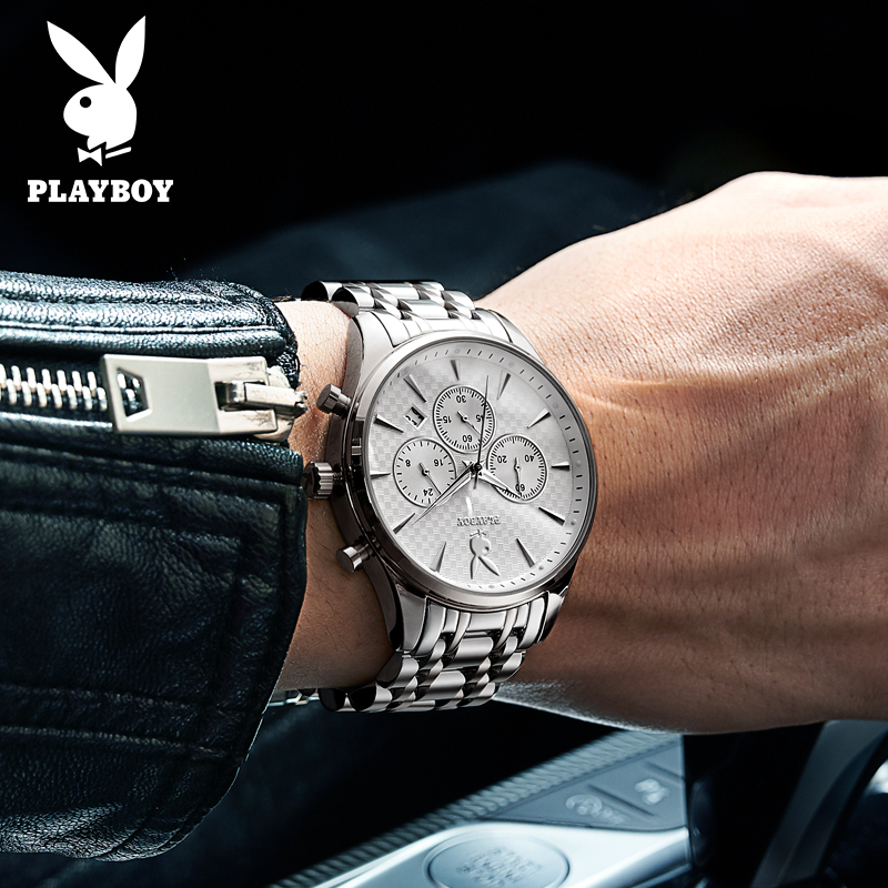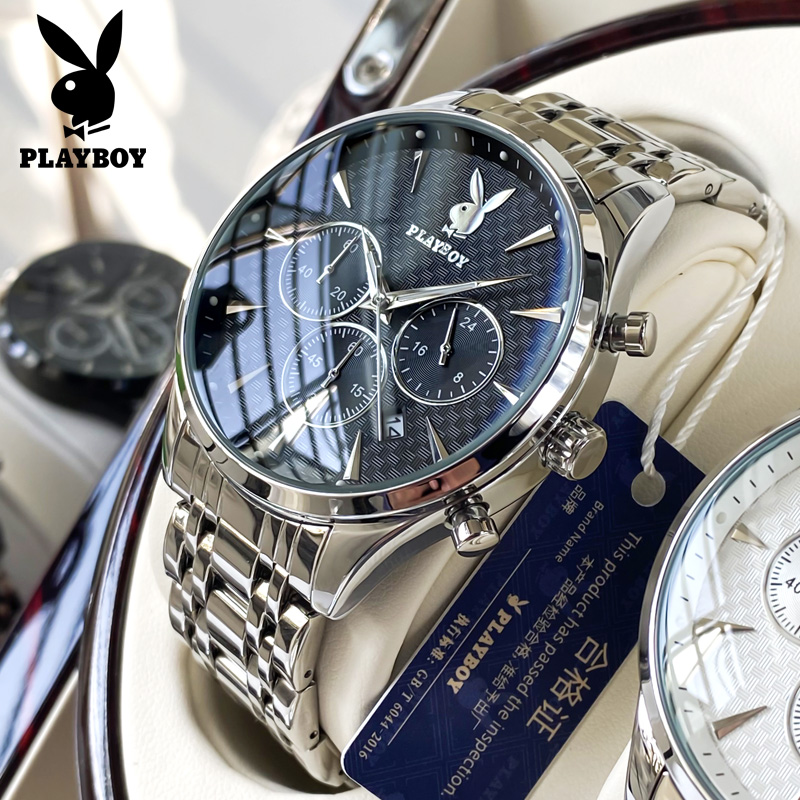 PLAYBOY Genuine Men Watches Business Luxury Stainless Steel Strap Multifunctional Luminous Calendar Chronograph Waterproof