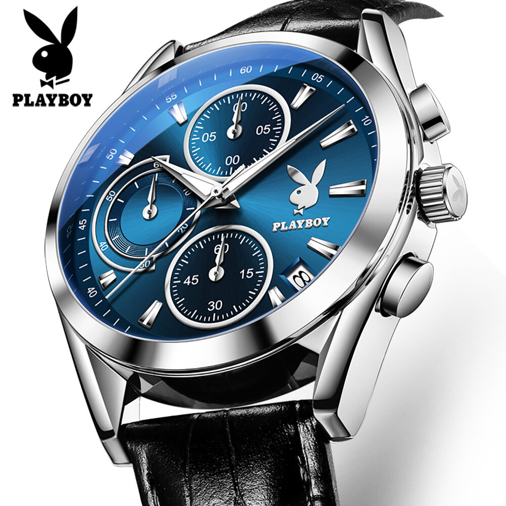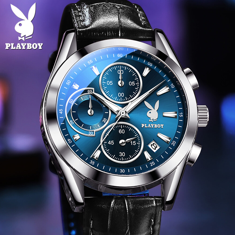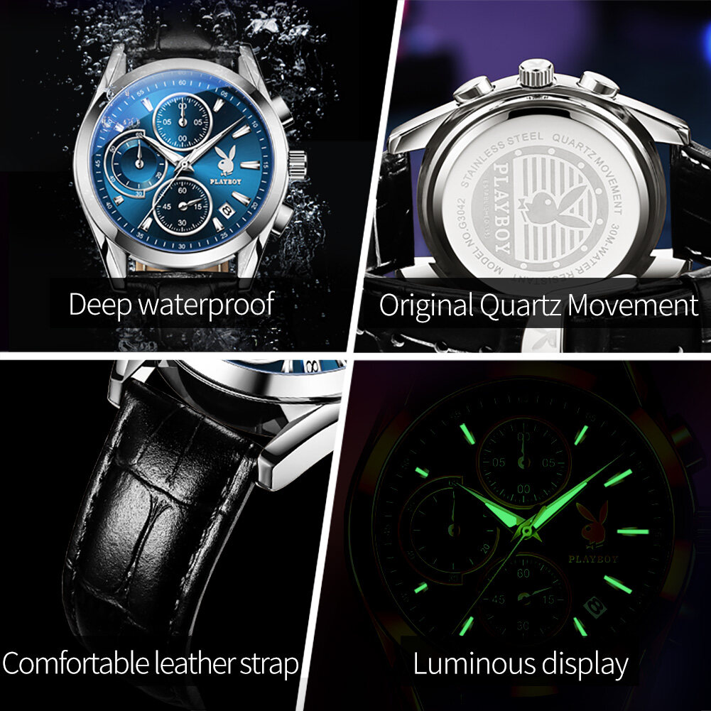 [Hot sale] PLAYBOY Watch For Men Original Waterproof 2022 Fashion Multifunction Dial Luxury Genuine Leather Strap Casual Mens Watch