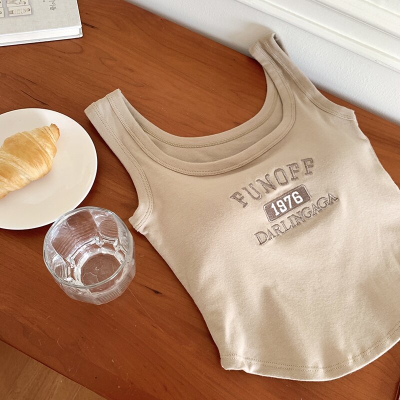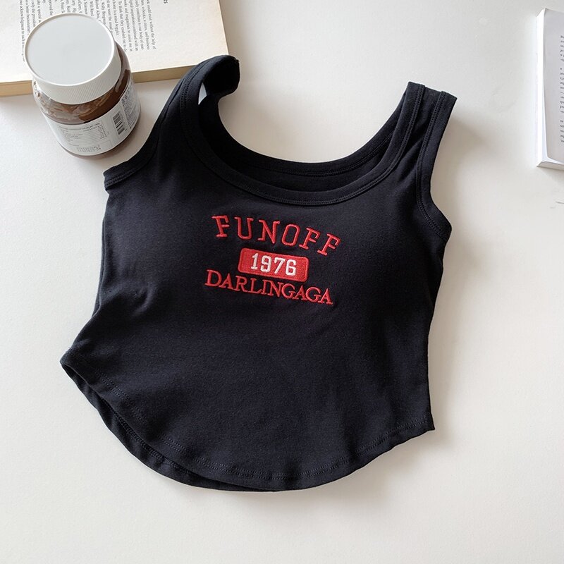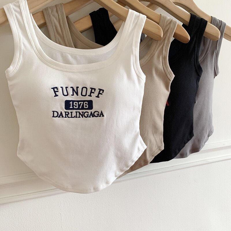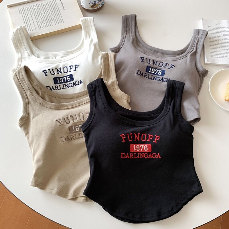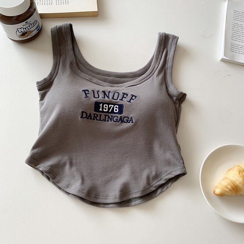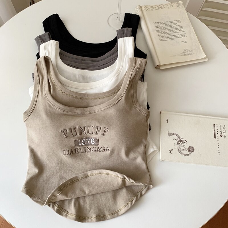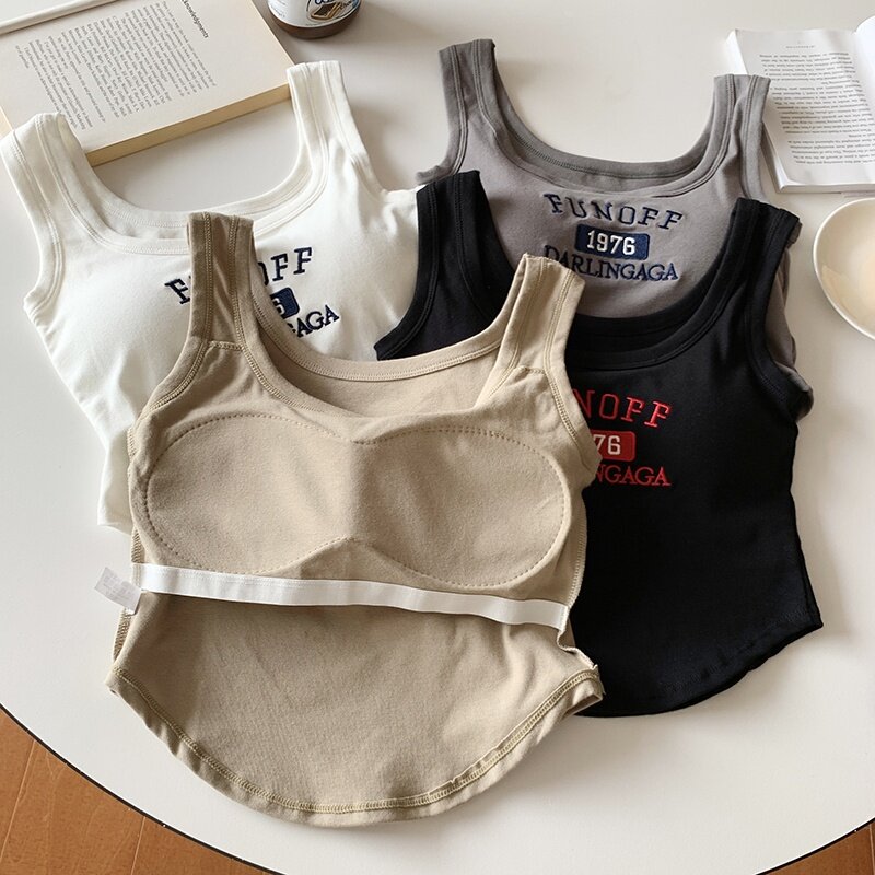 Women Letter Embroidery Camisole Summer Outer Wear Slim Short Vest with Chest Pad