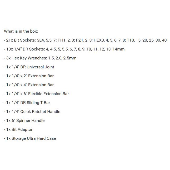 There are several 1/4" hex socket included, especially the 8mm, 10mm, 13mm which are used on many cars and bikes parts.