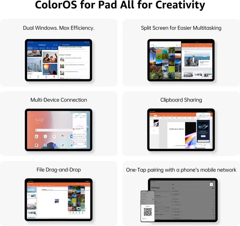 OPPO Pad Air runs on the newly upgraded ColorOS for Pad operating system. The tablet incorporates two new Multi-Screen Connect functions, namely file drag and drop and clipboard sharing, while maintaining the original unique functions for smart interactions, including two-finger split screen, four-finger floating window, and Smart Sidebar. When a phone is connected to the tablet, users can directly drag and drop photos and videos taken by the phone to the tablet for processing, making file transfers easier and faster. Additionally, users can also copy text on one device and paste it onto the other device, enabling users to improve their productivity through the seamless connection.
