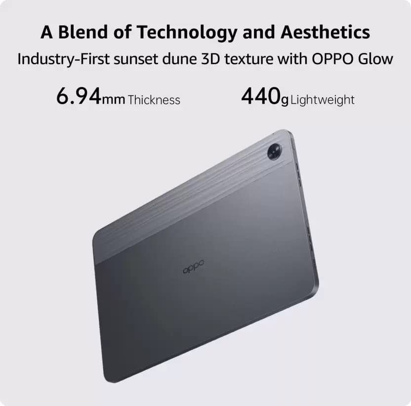 The OPPO Pad Air weighs about 440 g and is only 6.94 mm thick. The light in-hand feel makes it more comfortable to hold and its rear panel adopts the industry's first 3D finishing technology and exclusive metal splicing design to achieve ideal thinness without compromising on the design of the device.