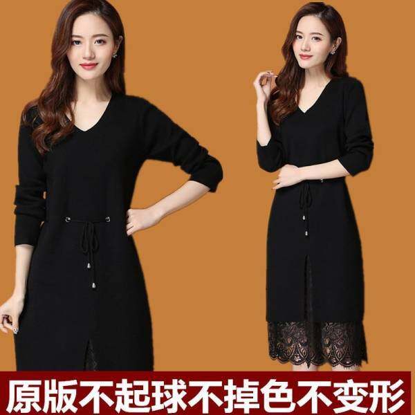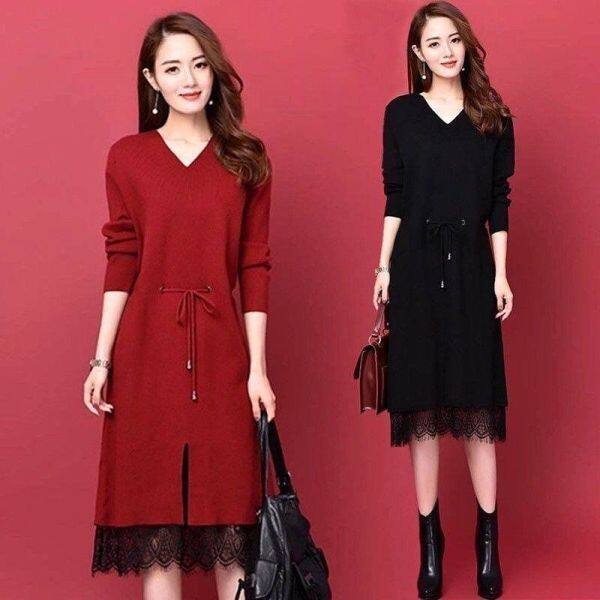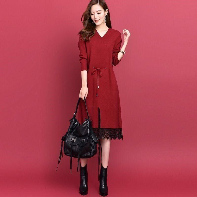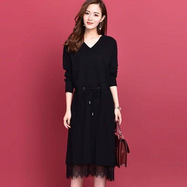 Dresses for Women Autumn New Korean V-neck Knitted Bottoming Dress Loose Plus Size Lace Skirt Tide