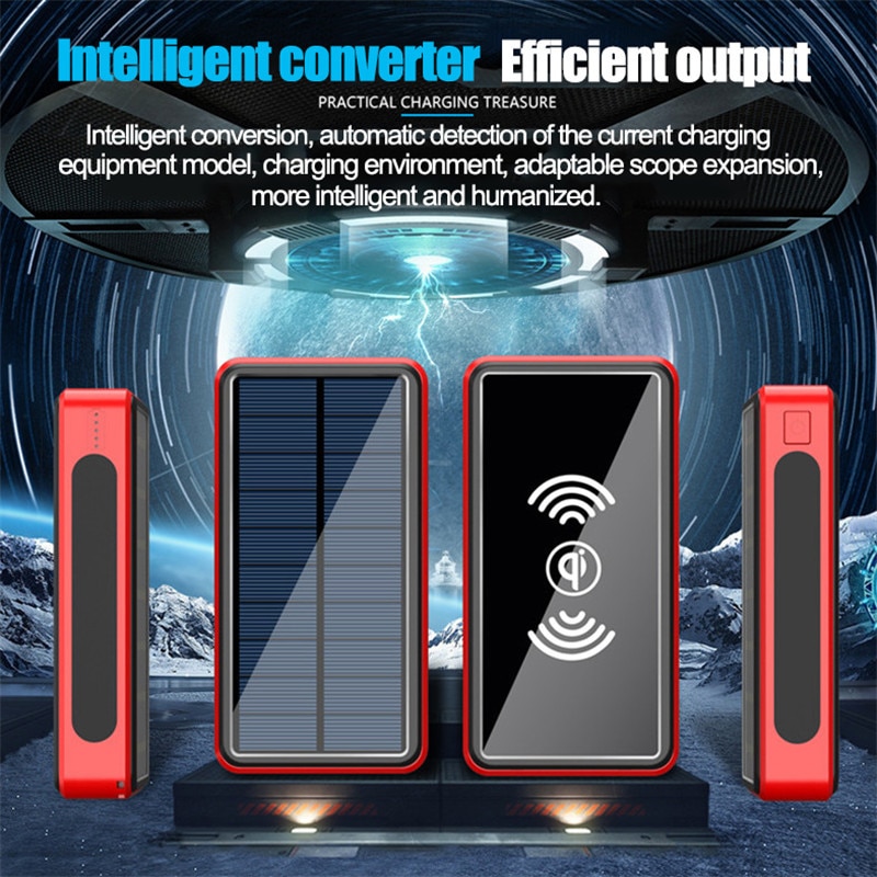 SHIP EVERYDAY!! ? 100% Original Product ? Follow our shop, you can receive a coupon ✅Battery Type: Li-polymer Battery ✅Features: with Solar Panel ✅Features: with Flashlight ✅Features: wireless charging ✅Output Interface: Four Usb ✅Output Interface: Wireless ✅Battery Capacity: 80000mAh ✅Charging Devices: for Tablet ✅Charging Devices: for Drones ✅Charging Devices: for Camera ✅Charging Devices: for Smartphone ✅Input Interface: Micro Usb ✅Input Interface: USB Type C ✅Input Interface: Apple Interface ✅Shell Material: Plastic ✅Type: Portable Power Bank ✅Weight: 420g ✅Size: 15 Warm remind: 1. Please charge it under STRONG sunlight, do not charge it in cloudy day or the place through glass(e.g a window or car) 2. Solar charging is designed for emergencies, not a primary source of charging due to the compact solar panel size and sunlight intensity, it could take 21 hours under direst strong light to fully charge(there are 7-8 hours of sunlight per day). So we highly recommend charge the solar charger via an adapter or computer, which only take a few hours 3.Normally, it can reach 25% battery after 5 hours recharge under strong sunlight, so only the first light will on 4. The water drops are good, but please don't immerse in the water for too long. Introduction: Suitable for tablets and mobile phones, regardless of Android and IOS systems After the refusal to go abroad, the dilemma that mobile phones and tablets cannot be charged because the charging head is not suitable 1. Original warranty company goods 2. Provide perfect after-sales service, do not reply after refusing to sell 3. Years of seller quality assurance 4. Providing lifetime warranty is our greatest sincerity 5. If you have any questions, please talk to us, no matter the product quality or express delivery, we will give you the best service 6. Super LED lights, no need to worry about the night Question: Q:How long does it take to fully charge the power bank? A:one night Q:How many times can the mobile phone be charged by the power bank once it is fully charged? A:8 to 12 times Q:What are the functions of this power bank? A:This power bank can be charged wirelessly, wiredly, and solar powered Q:Is the power bank waterproof? A:waterproof Q:How long does solar charging take to fully charge the phone? A:Solar charging is an emergency charging. Because the solar energy is relatively small and cannot meet the power supply demand of the power bank, the charging speed is slow