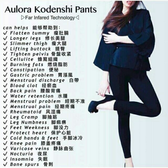 • Aulora Kodenshi Therapeutic Multi-Functional Healthcare Wellness Leggings Pants, simply beyond a slimming pants. Aulora Kodenshi has helped many people improved their health conditions:*Improve Blood Circulation 帮助血液循环