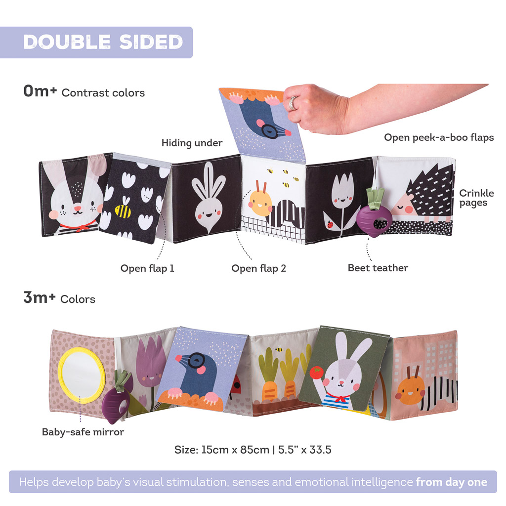 A double sided soft crinkle baby book from our Urban Garden collection for 2 developmental stages including 2 double-sided changing panels that includes an additional illustrations to capture baby’s attention and to refresh book’s look & feel. Includes a Baby-safe mirror, crinkle pages, sensory textures & beet teether.