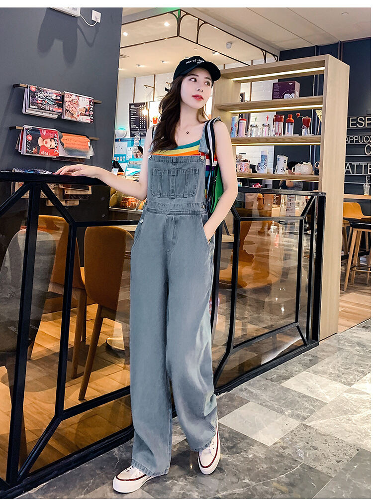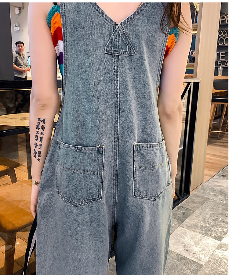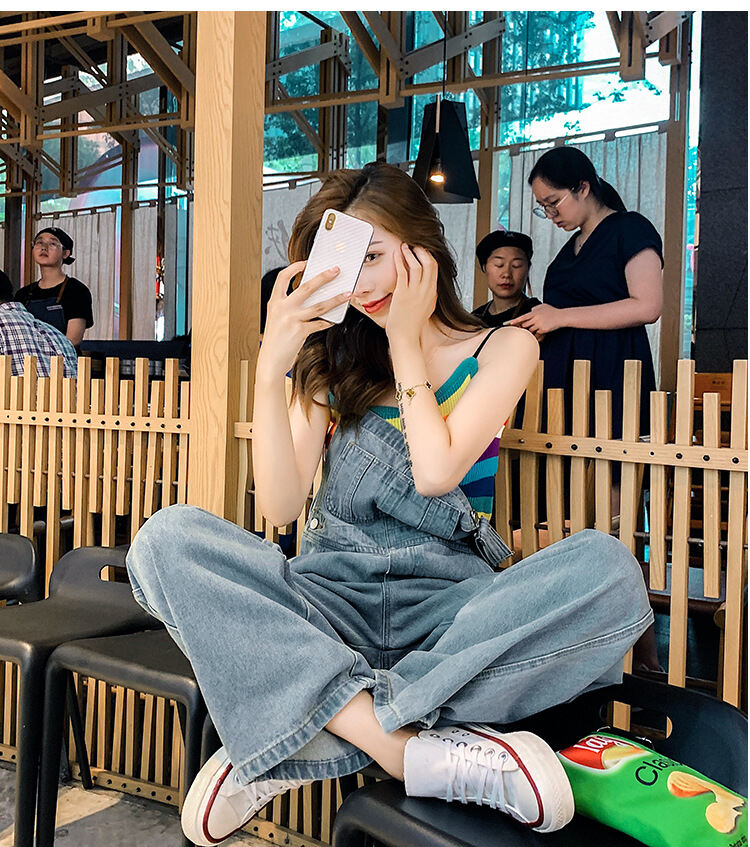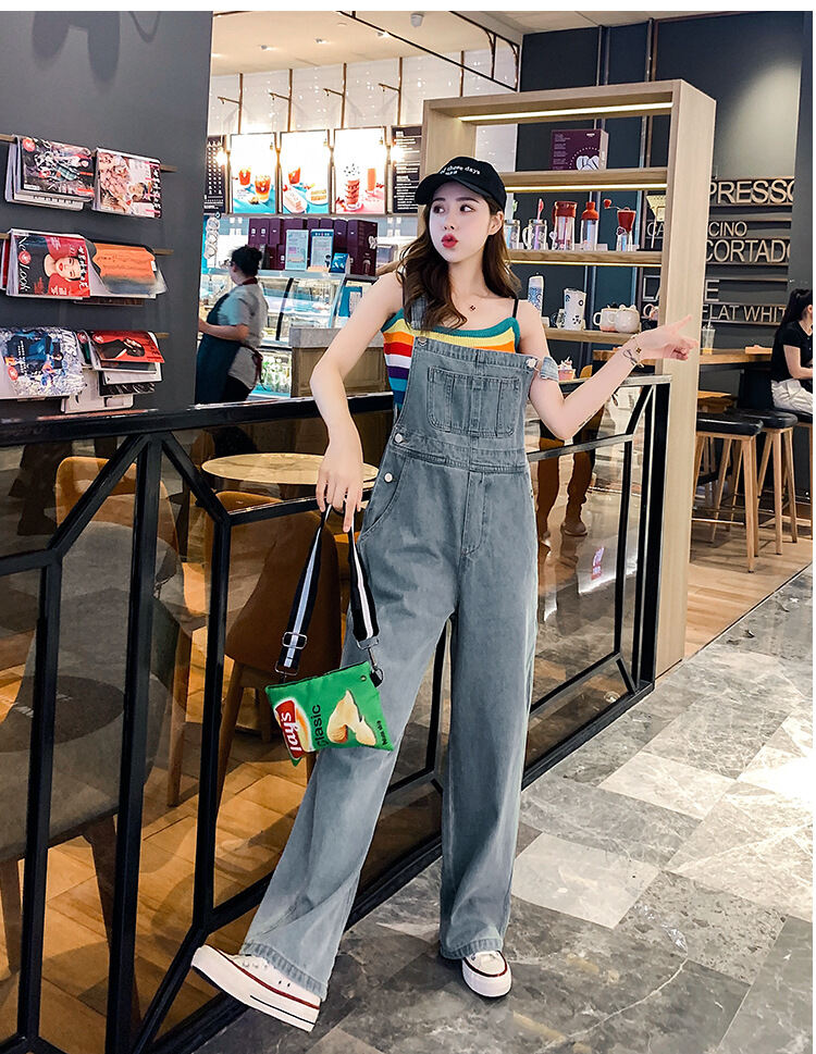Denim Suspender Pants Women's Korean Style Loose 2023 New Summer Age-Reducing Straight Wide-Leg Pants High Waist Drooping Jeans
