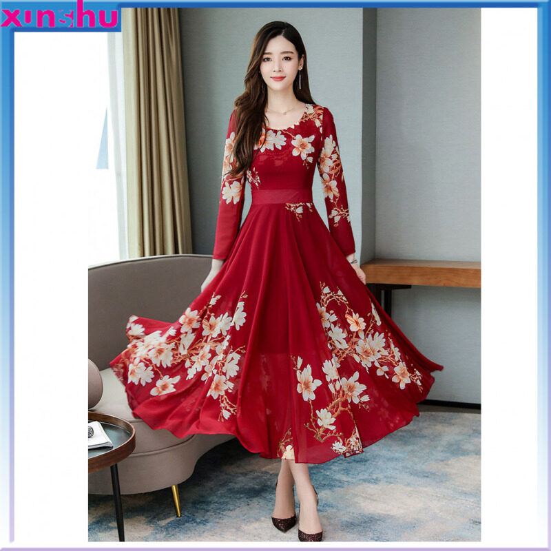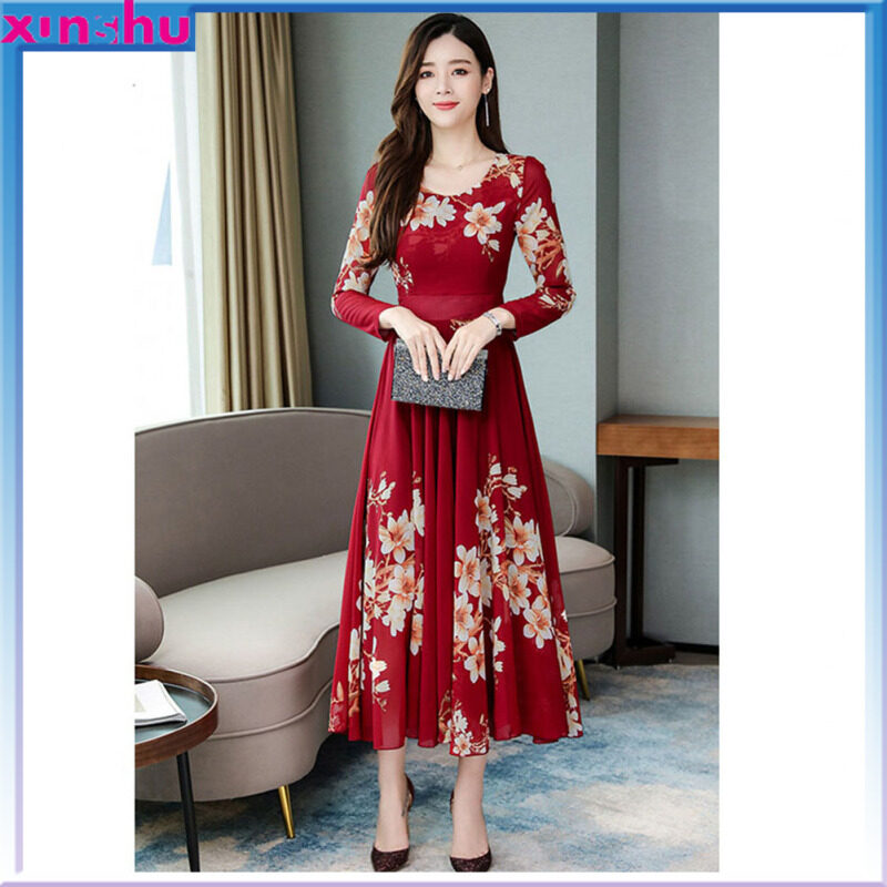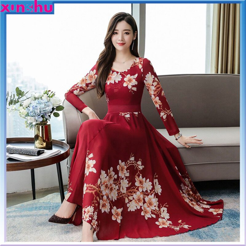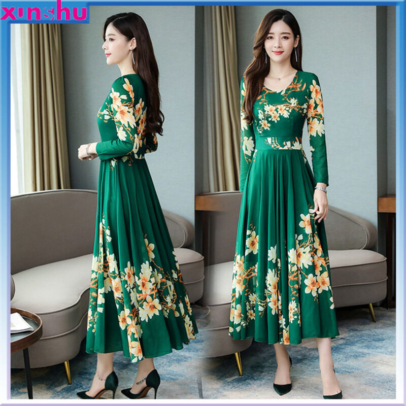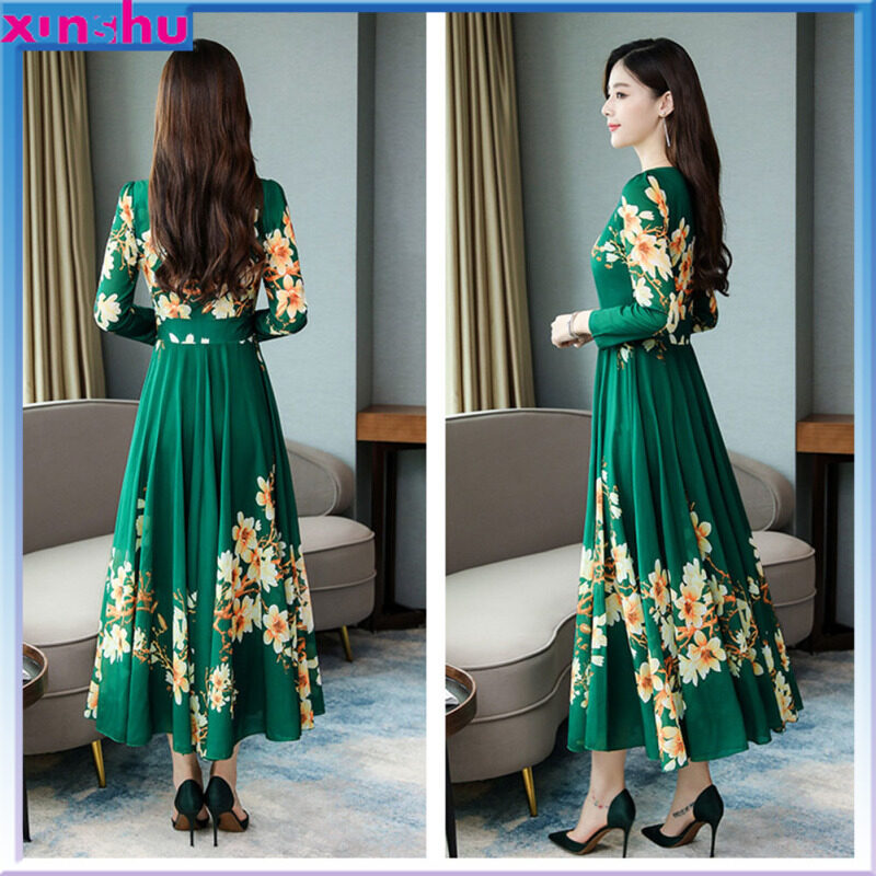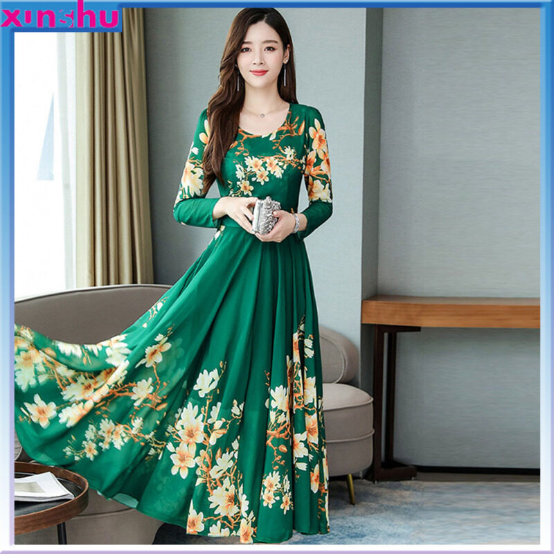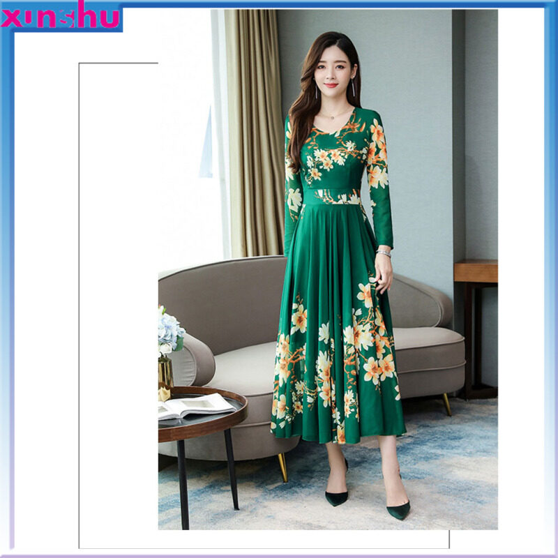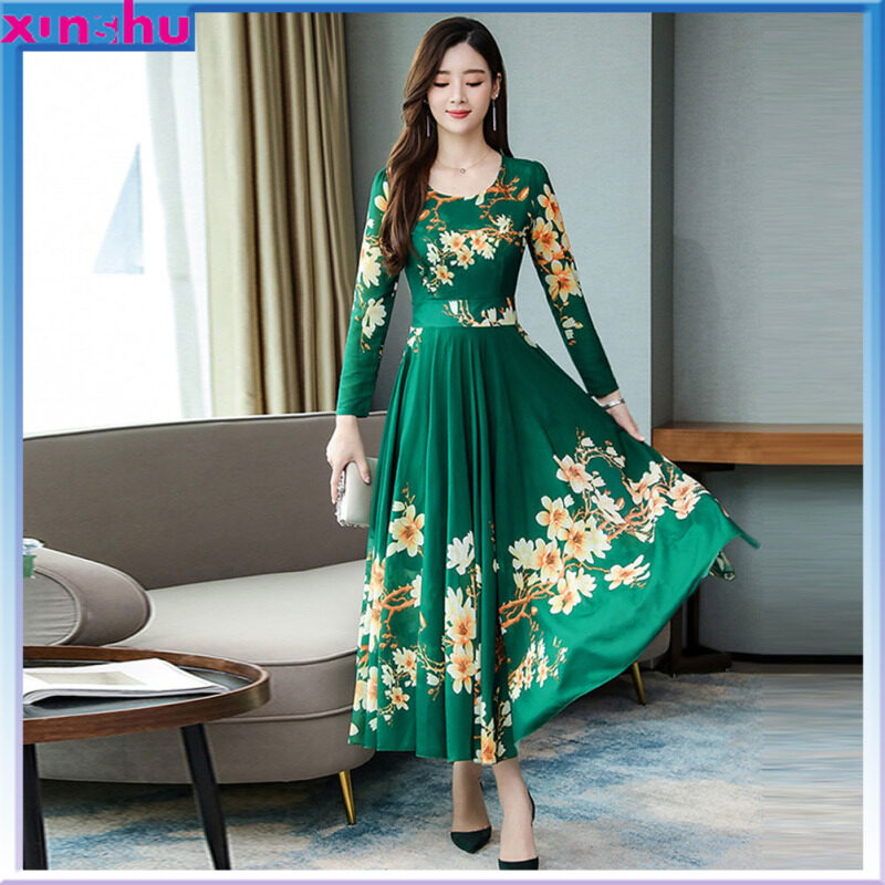 MA Summer Women Long Sleeves Dress Elegant Flower Printing Long Skirt Casual Round Neck Large Size Dress