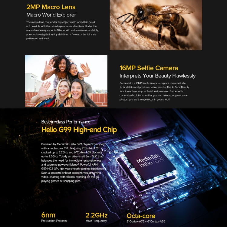 It is powered by Octa-Core MediaTek Helio G99 processor that works in unison to handle all the tasks. It comes with 128GB and 8GB RAM.
