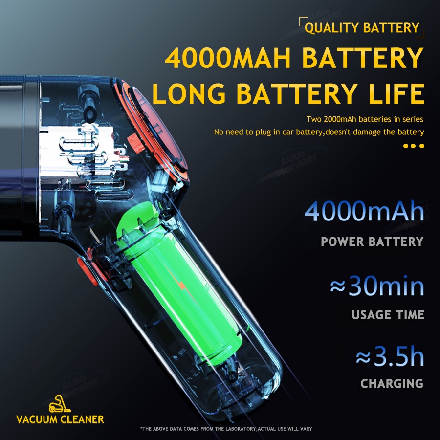 Quipped with 2*2000 mAh batteries in series, it only takes 3-4 hours to fully charge, and can maintain a cleaning time of 20-30 minutes, large-capacity aluminum battery, long-lasting battery life (recommended continuous use within 30 minutes)