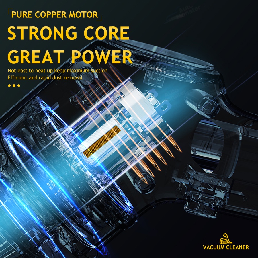 Using pure copper DC digital motor, the speed can reach 50,000 revolutions per minute, and the aluminum alloy supercharged fan blades produce 9000PA surging suction power, which can easily cope with various complex environments in the car