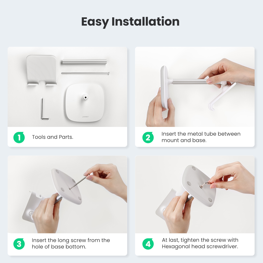 UGREEN tablet stand holder is made of high-quality aluminum alloy neck and multi-layer structured base, which build this desktop stand dock solid, durable and sturdy. It allows you to enjoy your favorite movies or reading when placing it on your desktop, bedside table, conference room and kitchen with tablets or phones.
