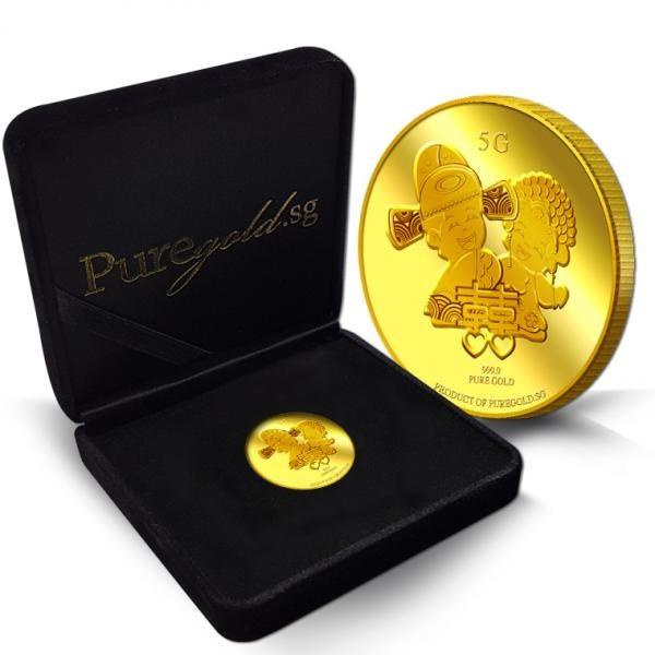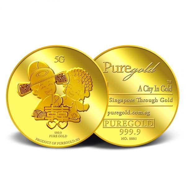 The Double Happiness gold coin design portrays a beautiful image a groom and a bride in traditional Chinese wedding costumes, behind the Chinese ligature of “Double Happiness”. The design also includes the inscription PRODUCT OF PUREGOLD.SG, as well as the coin’s weight and fineness.